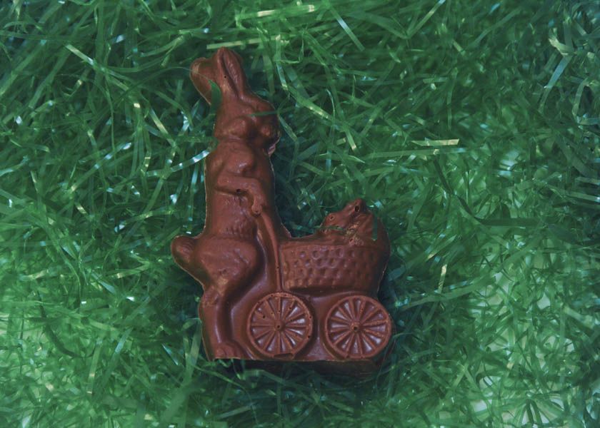 This unique bunny is made of approximately four ounces of solid milk chocolate, and measures about five inches tall.