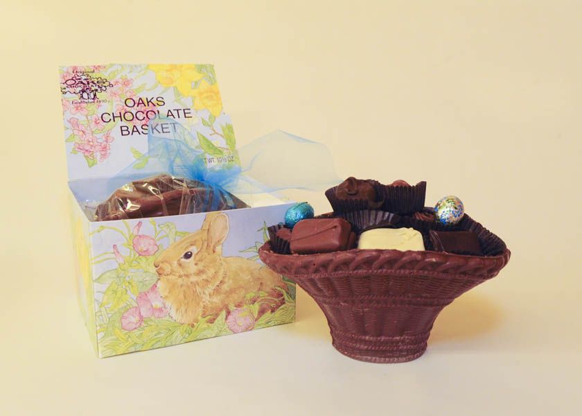Rich milk chocolate basket filled with a delicious assortment of Oaks Chocolates! The size of this basket is 10.5 ounces.